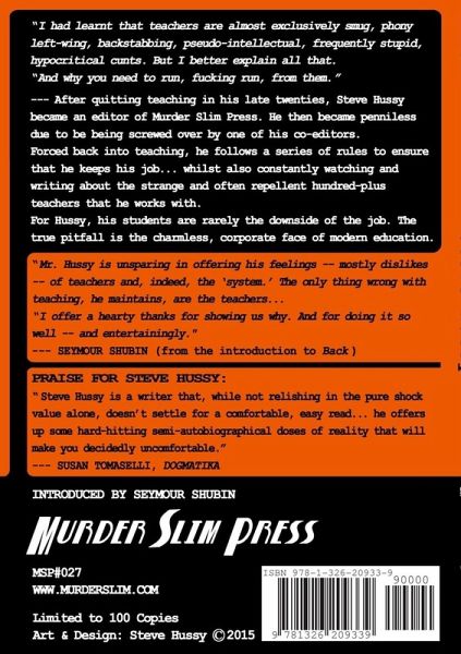 "I had learnt that teachers are almost exclusively smug, phony left-wing, backstabbing, pseudo-intellectual, frequently stupid, hypocritical cunts. But I better explain all that. "And why you need to run, fucking run, from them." --- After quitting teaching in his late twenties, Steve Hussy became an editor of Murder Slim Press. He then became penniless due to be being screwed over by one of his co-editors. Forced back into teaching, he follows a series of rules to ensure that he keeps his job... whilst constantly watching and writing about the strange and often repellent hundred-plus teachers that he works with. For Hussy, his students are rarely the downside of the job... The true pitfall is the charmless, corporate face of modern education. --- Hussy's sparse, venomous writing - first in STEPS and then in numerous literary magazines - has drawn comparisons to the darkest and most honest confessional writers.