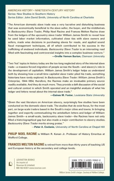 This book includes both the story of slave trader William James Smith and an examination in microcosm of the domestic slave trade in the South’s hinterland. The authors provide insight into the life and business of William James Smith to analyze the interior slave trade and characterizations of slave traders.