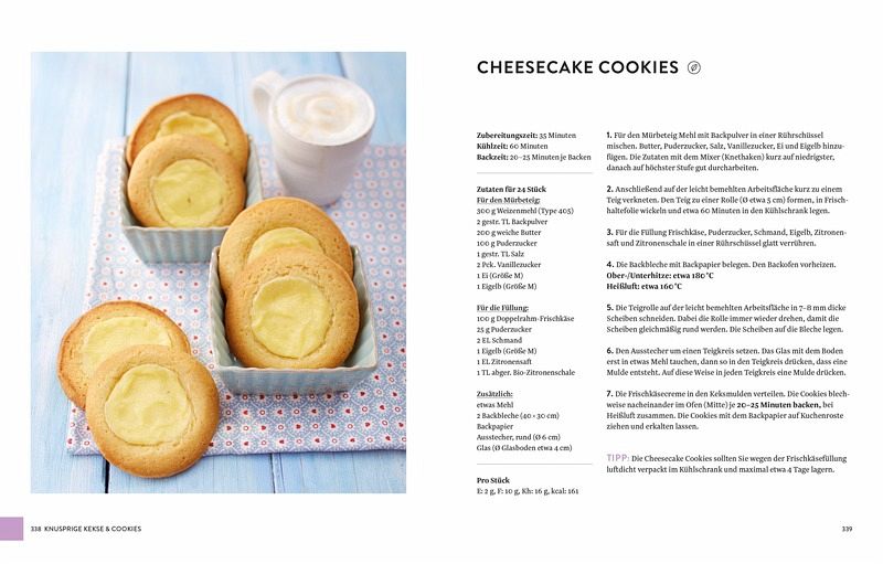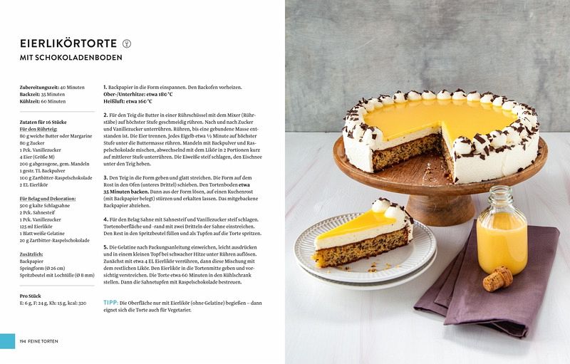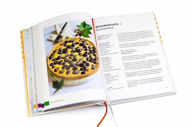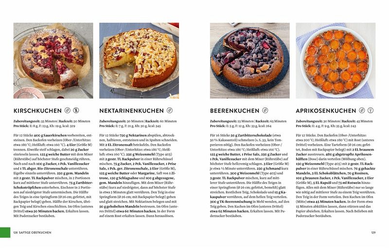 Die Kapitel lauten Luftige Kuchen & Tartes; Saftige Obstkuchen; Feine Torten; Zartes Kleingebäck; Knusprige Kekse & Cookies; Weihnachtsgebäck; Süßes für Feste & Gäste; Lockere Brote & Brötchen; Krosse Pizzen, Quiches & Co. Es finden sich klassische und moderne Rezepte gleichermaßen. Dabei lassen die Rezepte nichts zu wünschen übrig. Alle denkbaren Angaben stehen zur Verfügung, Zeitangaben, Zutatenlisten, Nährwerte, ausführliche und gut verständliche Arbeitsschritte, ggf. Tipps oder Varianten und vor allem immer ein aussagekräftiges Foto, das zum Nachmachen animiert und enorm appetitanregend ist. Zudem gibt es Symbole, die kennzeichnen, ob ein Rezept Alkohol enthält, glutenfrei, vegetarisch oder vegan ist.