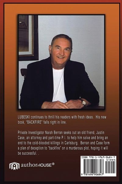 LUBESKI continues to thrill his readers with fresh ideas. His new book, "BACKFIRE" falls rignt in line. Private Investigator Naish Berran seeks out an old friend, Justin Case, an attorney and part-time P.I. to help him solve and bring an end to the cold-blooded killings in Carlsburg. Berran and Case form a plan of deception to "backfire" on a murderous plot, hoping it will be sucessfull. .