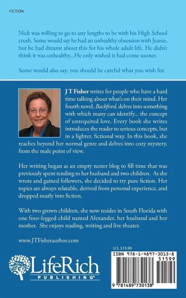 J T Fisher writes for people who have a hard time talking about what's on their mind. Her fourth novel, Backfired, delves into something with which many can identify... the concept of unrequited love. Every book she writes introduces the reader to serious concepts, but in a lighter, fictional way. In this book, she reaches beyond her normal genre and delves into cozy mystery, from the male point of view. Her writing began as an empty nester blog to fill time that was previously spent tending to her husband and two children. As she wrote and gained followers, she decided to try pure fiction. Her topics are always relatable, derived from personal experience, and dropped neatly into fiction. With two grown children, she now resides in South Florida with one four-legged child named Alexander, her husband and her mother. She enjoys reading, writing and live theater. www.JTFisherauthor.com