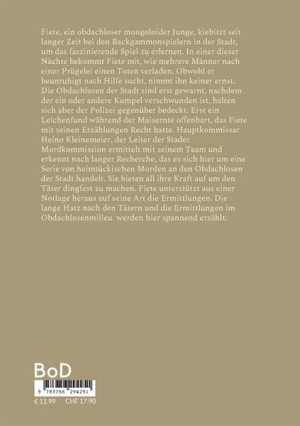 Fiete, ein obdachloser mongoloider Junge, kiebitzt seit langer Zeit bei den Backgammonspielern in der Stadt, um das faszinierende Spiel zu erlernen. In einer dieser Nächte bekommt Fiete mit, wie mehrere Männer nach einer Prügelei einen Toten verladen. Obwohl er beunruhigt nach Hilfe sucht, nimmt ihn keiner ernst. Die Obdachlosen der Stadt sind erst gewarnt, nachdem der ein oder andere Kumpel verschwunden ist, halten sich aber der Polizei gegenüber bedeckt. Erst ein Leichenfund während der Maisernte offenbart, das Fiete mit seinen Erzählungen Recht hatte. Hauptkommissar Heino Kleinemeier, der Leiter der Stader Mordkommission ermittelt mit seinem Team und erkennt nach langer Recherche, das es sich hier um eine Serie von heimtückischen Morden an den Obdachlosen der Stadt handelt. Sie bieten all ihre Kraft auf um den Täter dingfest zu machen. Fiete unterstützt aus einer Notlage heraus auf seine Art die Ermittlungen. Die lange Hatz nach den Tätern und die Ermittlungen im Obdachlosenmilieu werden hier spannend erzählt.