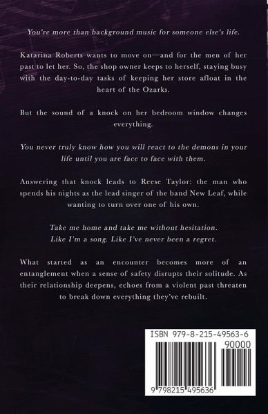 You're more than background music for someone else's life. Katarina Roberts wants to move on--and for the men of her past to let her. So, the shop owner keeps to herself, staying busy with the day-to-day tasks of keeping her store afloat in the heart of the Ozarks. But the sound of a knock on her bedroom window changes everything. You never truly know how you will react to the demons in your life until you are face to face with them. Answering that knock leads to Reese Taylor: the man who spends his nights as the lead singer of the band New Leaf, while wanting to turn over one of his own. Take me home and take me without hesitation. Like I'm a song. Like I've never been a regret. What started as an encounter becomes more of an entanglement when a sense of safety disrupts their solitude. As their relationship deepens, echoes from a violent past threaten to break down everything they've rebuilt.