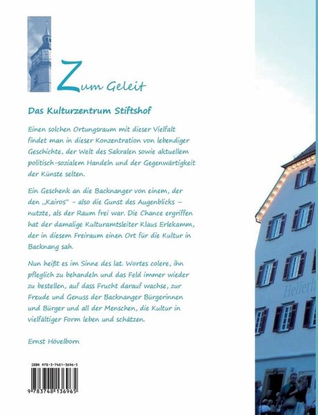 Das Kulturzentrum Stiftshof Einen solchen Ortungsraum mit dieser Vielfalt findet man in dieser Konzentration von lebendiger Geschichte, der Welt des Sakralen sowie aktuellem politisch-sozialem Handeln und der Gegenwärtigkeit der Künste selten. Ein Geschenk an die Backnanger von einem, der den "Kairos" - also die Gunst des Augenblicks - nutzte, als der Raum frei war. Die Chance ergriffen hat der damalige Kulturamtsleiter Klaus Erlekamm, der in diesem Freiraum einen Ort für die Kultur in Backnang sah. Nun heißt es im Sinne des lat. Wortes colere, ihn pfleglich zu behandeln und das Feld immer wieder zu bestellen, auf dass Frucht darauf wachse, zur Freude und Genuss der Backnanger Bürgerinnen und Bürger und all der Menschen, die Kultur in vielfältiger Form leben und schätzen. Ernst Hövelborn