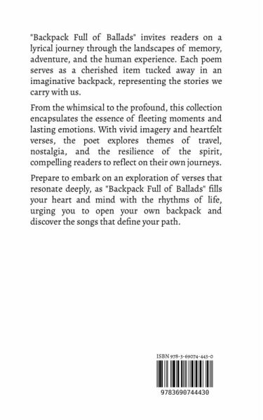 "Backpack Full of Ballads" invites readers on a lyrical journey through the landscapes of memory, adventure, and the human experience. Each poem serves as a cherished item tucked away in an imaginative backpack, representing the stories we carry with us. From the whimsical to the profound, this collection encapsulates the essence of fleeting moments and lasting emotions. With vivid imagery and heartfelt verses, the poet explores themes of travel, nostalgia, and the resilience of the spirit, compelling readers to reflect on their own journeys. Prepare to embark on an exploration of verses that resonate deeply, as "Backpack Full of Ballads" fills your heart and mind with the rhythms of life, urging you to open your own backpack and discover the songs that define your path.