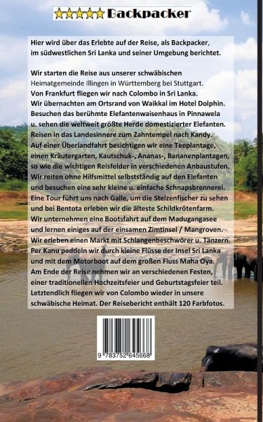 Hier wird über das Erlebte auf der Reise, als Backpacker, im südwestlichen Sri Lanka und seiner Umgebung berichtet. Wir starten die Reise aus unserer schwäbischen Heimatgemeinde Illingen in Württemberg bei Stuttgart. Von Frankfurt fliegen wir nach Colombo in Sri Lanka.Wir übernachten am Ortsrand von Waikkal im Hotel Dolphin. Besuchen das berühmte Elefantenwaisenhaus in Pinnawelau. sehen die weltweit größte Herde domestizierter Elefanten. Reisen in das Landesinnere zum Zahntempel nach Kandy.Auf einer Überlandfahrt besichtigen wir eine Teeplantage, einen Kräutergarten, Kautschuk-, Ananas-, Bananenplantagen, so wie die wichtigen Reisfelder in verschiedenen Anbaustufen.Wir reiten ohne Hilfsmittel selbstständig auf den Elefanten und besuchen eine sehr kleine und einfache Schnapsbrennerei. Eine Tour führt uns nach Galle, um die Stelzenfischer zu sehenund bei Bentota erleben wir die älteste Schildkrötenfarm.Wir unternehmen eine Bootsfahrt auf dem Madugangasee und lernen einiges auf der einsamen Zimtinsel / Mangroven. Wir erleben einen Markt mit Schlangenbeschwörer und Tänzern.Per Kanu paddeln wir durch kleine Flüsse der Insel Sri Lanka und mit dem Motorboot auf dem großen Fluss Maha Oya. Am Ende der Reise nehmen wir an verschiedenen Festen,einer traditionellen Hochzeitsfeier und Geburtstagsfeier teil.Letztendlich fliegen wir von Colombo wieder in unsere schwäbische Heimat. Der Reisebericht enthält 120 Farbfotos.