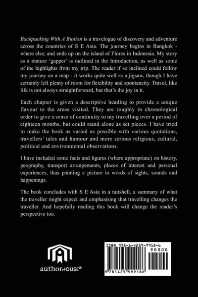 'Backpacking With A Bunion' is a travelogue of discovery and adventure across the countries of S E Asia. The journey begins in Bangkok - where else; and ends up on the island of Flores in Indonesia. My story as a mature 'gapper' is outlined in the Introduction, as well as some of the highlights from my trip. The reader if so inclined could follow my journey on a map - it works quite well as a jigsaw, though I have certainly left plenty of room for flexibility and spontaneity. Travel, like life is not always straightforward, but that's the joy in it. Each chapter is given a descriptive heading to provide a unique flavour to the areas visited. They are roughly in chronological order to give a sense of continuity to my travelling over a period of eighteen months, but could stand alone as set pieces. I have tried to make the book as varied as possible with various quotations, travellers' tales and humour and more serious religious, cultural, political and environmental observations. I have included some facts and figures (where appropriate) on history, geography, transport arrangements, places of interest and personal experiences, thus painting a picture in words of sights, sounds and happenings. The book concludes with S E Asia in a nutshell, a summary of what the traveller might expect and emphasising that travelling changes the traveller. And hopefully reading this book will change the reader's perspective too.