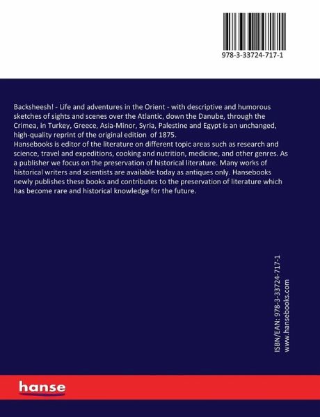 Backsheesh! - Life and adventures in the Orient - with descriptive and humorous sketches of sights and scenes over the Atlantic, down the Danube, through the Crimea, in Turkey, Greece, Asia-Minor, Syria, Palestine and Egypt is an unchanged, high-quality reprint of the original edition of 1875.Hansebooks is editor of the literature on different topic areas such as research and science, travel and expeditions, cooking and nutrition, medicine, and other genres. As a publisher we focus on the preservation of historical literature. Many works of historical writers and scientists are available today as antiques only. Hansebooks newly publishes these books and contributes to the preservation of literature which has become rare and historical knowledge for the future.