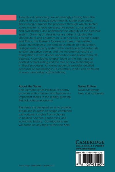Backsliding shows how elected rulers can weaken checks on executive power, curtail political rights, and undermine electoral systems. Based on sixteen detailed case studies, Backsliding demonstrates the pernicious effects of polarization, complicit legislatures and the incremental nature of derogations from democratic rule.