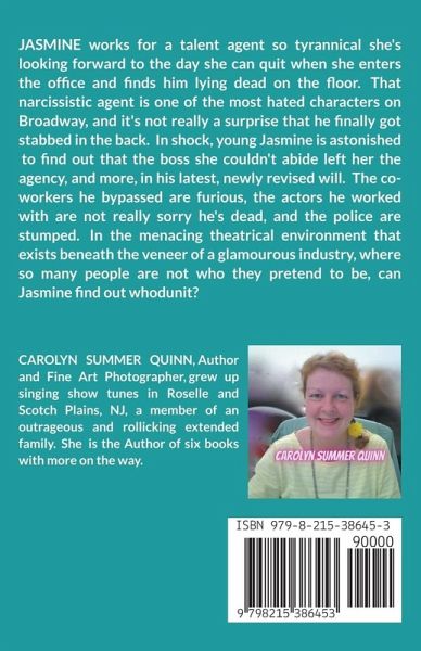 Jasmine works for a talent agent so tyrannical she's looking forward to the day she can quit when she enters the office and finds him dead on the floor. That narcissistic agent is one of the most hated characters on Broadway, and it's not really a surprise that he finally got stabbed in the back. Already in shock, young Jasmine is furuther astonished to find out that the boss she couldn't abide left her the agency, and everything else he owned, in his latest, newly revised will. The co-workers he bypassed are furious, the actors he worked with are not really sorry he's dead, and the police are stumped. In the menacing theatrical environment that exists beneath the veneer of a glamorous industry, where so many people are not who they pretend to be, can Jasmine find out whodunit?