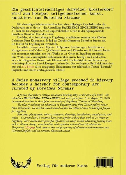 Ein geschichtsträchtiges Schweizer Klosterdorf wird zum Hotspot zeitgenössischer Kunst, kuratiert von Dorothea Strauss Ein ehemaliges Schuhmacherhäuschen, eine stillgelegte Kegelbahn oder der Dachboden eines Hotels - die Ausstellung BACKSTAGE ENGELBERG fand vom 23. Juni bis 18. August 2024 an ungewöhnlichen Orten in der Alpengemeinde Engelberg (Kanton Obwalden) statt. Die Idee, eine Ausstellung in Engelberg zu realisieren, stammt vom Zürcher Galeristen Peter Kilchmann. Er lud die Zürcher Kuratorin Dorothea Strauss ein, ein Projekt für Engelberg zu entwickeln. Gemälde, Fotografien, Objekte, Skulpturen, Zeichnungen, Installationen, Klangarbeiten und Videos - 53 Künstlerinnen und Künstler aus 18 Ländern haben sich zusammengefunden, um ihre Werke an 21 Orten in Engelberg zu zeigen. Ihre Werke sind eindringliche Reflexionen über unsere heutige Welt und setzen sich mit drängenden Themen wie Klimawandel, Nachhaltigkeit und brisanten gesellschaftspolitischen Entwicklungen auseinander. Das vorliegende Buch dokumentiert nun auf 280Seiten diese einzigartige Erlebnisreise mit zahlreichen Texten (Deutsch/Englisch) und einem umfangreichen Bildteil.