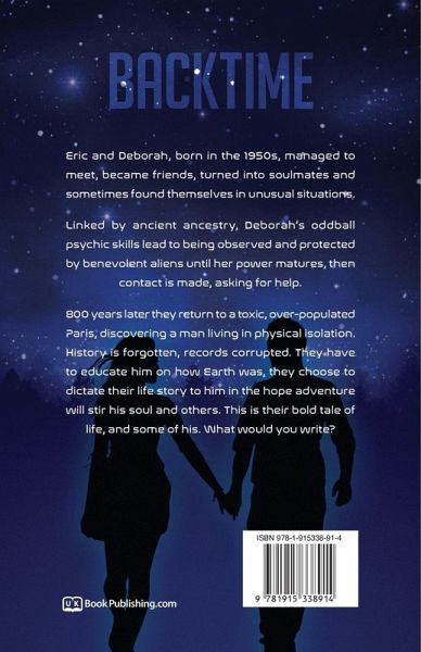 Eric and Deborah, born in the 1950s, managed to meet, became friends, turned into soulmates and sometimes found themselves in unusual situations. Linked by ancient ancestry, Deborah's oddball psychic skills lead to being observed and protected by benevolent aliens until her power matures, then contact is made, asking for help. 800 years later they return to a toxic, over-populated Paris, discovering a man living in physical isolation. History is forgotten, records corrupted. They have to educate him on how Earth was, they choose to dictate their life story to him in the hope adventure will stir his soul and others. This is their bold tale of life, and some of his. What would you write?