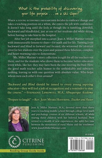 When a young economics researcher decides to embrace change and takes a teaching position on a whim, she enters the job with confidence. It doesn't take long until she feels as though she is tumbling downhill, backward and blindfolded, just as one of her students did while skiing, before having to take him to the hospital. After her job morphed into a career, Jean A. Miller Mariner retired with immeasurable lessons to share-for math and for life. Turning from backward and blind to forward and focused, she witnessed the identical pivot for her students over the years and penned these hilarious, complex, and heart-warming tales to demonstrate. Ms. Miller Mariner's story collection is a gift for all the teachers out there, and for the students who drove them to become better educators (even while, like her, they may have been the one steering the bus). Here the good math teacher adds humor to the unthinkable and subtracts nothing, leaving us with one question with absolute value: Who helps whom turn each other's lives around?