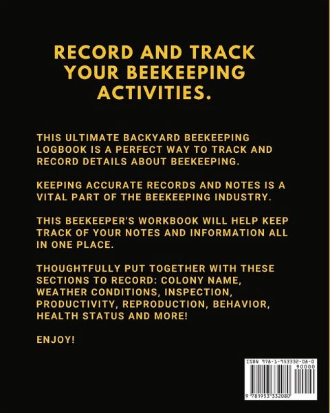 How to use this BACKYARD Beekeeping Log Book: 8 X 10 Inches & 110 Pages This ultimate BACKYARD BEEKEEPING LOGBOOK is a perfect way to track and record all your beekeeping activities. This unique Beekeeper's Journal is a great way to keep all of your important information all in one easy to find spot. Each interior page includes prompts and space to record the following: Colony Name - Write the name of the colony. Date - Use the box provided to write in the date. Weather Conditions - Stay on task using this space to record weather from sunny to rainy conditions. Inspection - Rate the bee hive from 1-6 upon inspection. Hive Number - Use the box to check mark the bee hive. Productivity/Reproduction - Stay on task using the boxes for amount of honey, general population, amount of brood, and amount of space. Behavior and Activities - Write the usual entering and ending activities, calm behavior when opening hive, bees bringing to hive, signs of robbery among the bees. Health Status - Checklist if the bees seem weak or lazy, high amount of dead bees, queen bee is present, if she is identifiable, any infestation by ants, wax moth or any negative odor noted. If you are new to beekeeping or have been at it for a while, this cute beekeeping journal is a must have! Can make a great useful gift for anyone that loves the hobby of beekeeping! Have Fun!