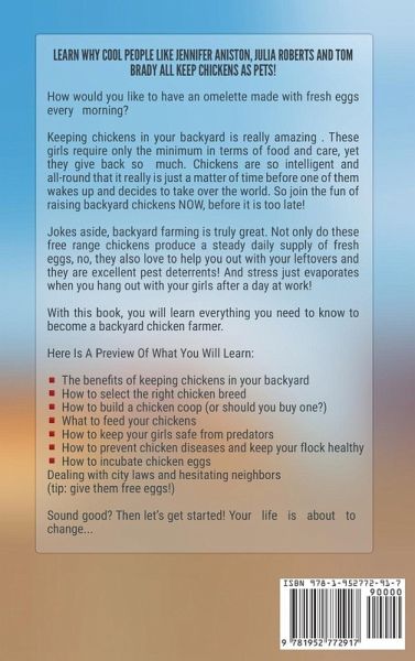Learn How to Raise Chickens in Your Own Backyard! Learn why cool people like Jennifer Aniston, Julia Roberts, and Tom Brady all keep chickens as pets! How would you like to have an omelet made with fresh eggs every morning? By keeping chickens in your backyard that dream can become a reality! Raising backyard chickens is taking the world by storm. And rightfully so. Get Your Copy of 'Backyard Chickens' These girls are really amazing. They require only the minimum in terms of food and care, yet they give back so much. Chickens are so intelligent and all-round that it really is just a matter of time before one of them wakes up and decides to take over the world. So join the fun of raising backyard chickens NOW, before it is too late! Jokes aside, backyard farming is truly great. Not only do these free-range chickens produce a steady daily supply of fresh eggs. No, they also love to help you out with your leftovers and they are excellent pest deterrents! One thing that few ever think of is how stress just evaporates in the presence of a healthy chicken flock. Sitting in your backyard and hearing the chickens talk to each other: it is so relaxing after a day at work! Caring for free chickens might just be the best way to recover from a burn-out. They have a soft clucking sound as they go about their business. It is quite soothing to the soul, and if you don't watch out, it can put you right to sleep in that garden swing. Why You Should Check Out 'Backyard Chickens' With this book, you will learn everything you need to know to successfully raise chickens in your backyard. Here's What You Will Learn: - The benefits of keeping chickens in your backyard - How to select the right chicken breed - How to build a chicken coop (or should you buy one?) - What to feed your chickens - How to keep your girls safe from predators - How to prevent chicken diseases and keep your flock healthy - How to incubate chicken eggs - Dealing with city laws and hesitating neighbors (tip: give them free eggs!) Finally, as a FREE & EXCLUSIVE BONUS, you're also getting 11 super funny chicken jokes from my '101 Hilarious Chicken Jokes & Riddles For Kids.' Sound good? Then let's get started! Your life is about to change... Take action now! Scroll to the top of this page and click the 'Buy Now' button.