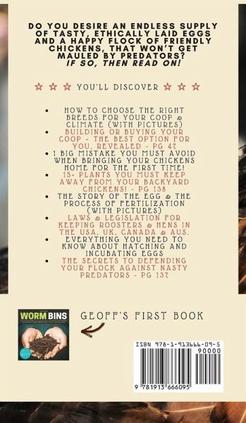 Do you desire an endless supply of tasty, ethically laid eggs and a happy flock of friendly chickens, that won't get mauled by predators? Then read on! By now, you're probably already aware of the countless benefits of raising and breeding your own friendly, loveable chickens. These intelligent and highly amusing backyard companions will provide you with tastier and more nutritious (up to 3x more vitamin E and 70% more vitamin B12) eggs compared to what you can find at the local store. They'll also enjoy a better quality of life, and can be a natural form of pest control on your land. Are you about to embark on your exciting new backyard chicken journey? Do you just feel like you need a little extra guidance from a fifth-generation expert before you get started? As a new chicken keeper, there are numerous aspects that you can easily get wrong, leading to an unhappy flock, injury, disease, and sadly even death in the worst cases.Whether it's unsuspecting plants like buttercups or climbing lily in your yard; the coyotes, owls or the biting flies - it's crucial to know where the biggest problems most commonly come from, and then to understand precisely how to prevent them - to ensure that your precious flock is happy, healthy and safe. Geoff and his family have raised and bred backyard chickens for decades, and the author has incredible insights and guidance to share with you, as you embark on your new journey. ¿ ¿ ¿ In Backyard Chickens, you'll discover: ¿ ¿ ¿How to choose the right breeds for your coop & climate (with pictures) Building or buying your coop - the best option for you, revealed - Pg 47 How you can still take vacations and holidays while keeping your chickens happy! 1 BIG mistake you must avoid when bringing your chickens home for the first time! 15+ Plants you must keep away from your backyard chickens! - Pg 138 The story of the egg & the process of fertilization (with pictures) The easiest and fastest ways to make money from your backyard chicken hobby... Caring for baby chicks, so they grow up affectionate to you Laws & Legislation for keeping roosters & hens in the USA, UK, Canada & Australia Everything you need to know about hatching and incubating eggs The secrets to defending your flock against nasty predators - Pg 137 How to stop accidentally feeding mice and other rodents! A detailed description of how to butcher your broilers - Pg 203 Know this one crucial thing about the pecking order to keep your chickens happy! Identifying & treating common health problems.... Even if you've never held a chicken in your life 10 Myths & Misconceptions that cause beginners to fail (but not you) Even if you're brand new to keeping chickens, with the secrets uncovered inside this book - you'll know precisely how to keep a happy flock and have more nutrient-rich, tasty eggs than you ever imagined! This book makes it so simple that even a 5-year-old could keep chickens! Scroll up now and click 'Add to Cart'