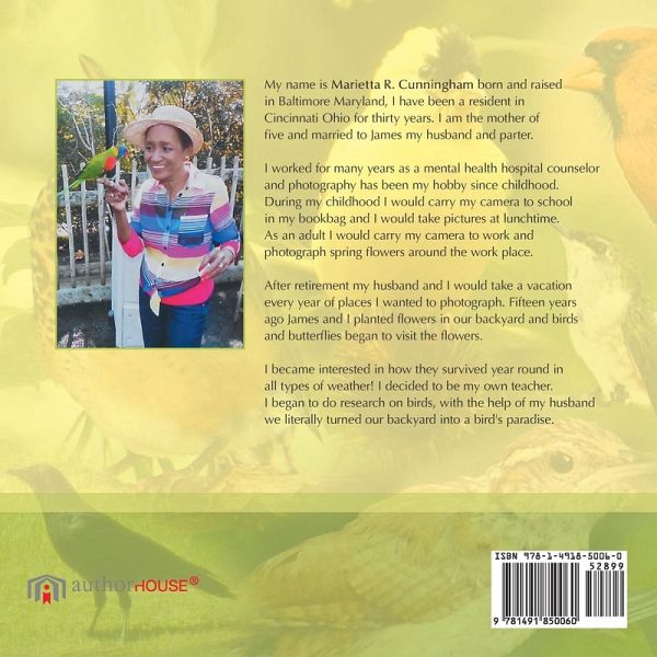 This book is about the many birds that visit my backyard year around. I have taken my skills in photography to capture remakable, colorful birds in their everyday habit and to share with you, the readers of this book, pictures and information about birds that may have visited your backyard. At any time of year, you can look around in your backyard and a colorful little bird will catch your eye. After watching the birds in my backyard for a few months, I decided to intentionally attract them to the backyard more often. I went to the local library and begin a research on birds. I discovered that children and adults are fascinated by birds and that millions of people in the United States paticpate in feeding wild birds. This trend is rapidly growing today. In my research I found that birds require four basic things to surive in the wild: food, water, protection from danger, and a place to raise their young safety. In nature birds fulfill these needs in a variety of ways. Birds choose their menu from the wide variety of resources that nature provides. Foods they eat in clude insects, spiders, grubs and worms, nuts and seeds, soft fruits and berries, tree sap, flower nectar, the tender young leaves and buds of grass trees, and shrubs. Birds can be resourceful in finding water: a birdbaths, rain puddles, garden hoses and streams. Birds protect their young from cats and squirrels by building nesting holes in tree trunks. They build a nest in the crotch of tree limbs or shrub branches with sticks an twigs, grass, leaves and strips of bark, string, yarn and tissue. Birds have been around at least 140 million years. 8,650 speciesof birds have been identfied in the world today.