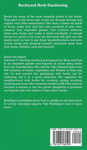 Herbs are some of the most versatile plants in the world. They grow in the worst type of soil, are drought tolerant and require very little maintenance. Use them to flavor all kinds of foods, make skin and hair care products of your own, enhance your vegetable garden, cure common ailments, clean your home and make it smell wonderful. It sounds almost too good to be true, but this book will give you the inside story on how to use these wonderful plants and save money along with keeping harmful chemicals away from your home, children, pets and yourself. About the Expert Deborah C. Harding watched and helped her Mom and Dad in an extensive garden and learned all about using herbs from her Grandmother. She and her late husband grew over 250 varieties of herbs, vegetables and flowers in their tiny city lot and proved that gardening with herbs can be addicting, but it is a good addiction. She supplied the neighborhood with herbs for cooking, curing, scenting, cleaning and more. She currently resides in NE Ohio and has become a teacher to her two grown daughters, a grandson and anyone else who wants to learn about herbs. HowExpert publishes quick 'how to' guides on all topics from A to Z by everyday experts.