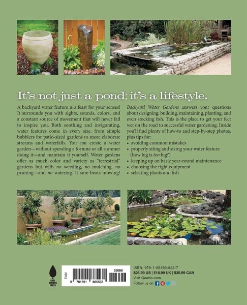 Backyard Water Gardens: How to Build, Plant & Maintain Ponds, Streams & Fountains It's Not Just a Pond--It's a Lifestyle A backyard water feature is a feast for your senses! It surrounds you with sights, sounds, colors, and a constant source of movement that will never fail to inspire you. Both soothing and invigorating, water features come in every size, from simple bubblers for patio-sized gardens to more elaborate streams and waterfalls. You "can" create a water garden--without spending a fortune or all summer doing it--and maintain it yourself. Water gardens offer as much color and variety as "terrestrial" gardens but with "no" weeding, "no "mulching, "no" pruning--and "no" watering. It sure beats mowing! "Backyard Water Gardens" answers your questions about designing, building, maintaining, planting, and even stocking fish. This is the place to getyour feet wet on the road to successful water gardening. Inside you'll findplenty of how-to and step-by-step photos, plus tips for: - avoiding common mistakes - properly siting and sizing your water feature (how big is "too" big?) - keeping up on basic year-round maintenance - choosing the right kind of equipment - selecting plants and fish It's not just a pond; it's a lifestyle. Join in the fun today.