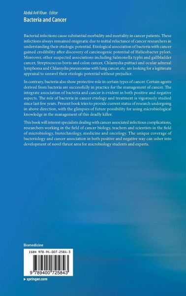 Bacterial infections cause substantial morbidity and mortality in cancer patients. These infections always remained enigmatic due to initial reluctance of cancer researchers in understanding their etiologic potential. Etiological association of bacteria with cancer gained credibility after discovery of carcinogenic potential of Helicobacter pylori. Moreover, other suspected associations including Salmonella typhi and gallbladder cancer, Streptococcus bovis and colon cancer and Chlamydia pneumoniae with ocular adnexal lymphoma etc. are looking for a legitimate appraisal to unravel their etiologic potential without prejudice. In contrary, bacteria also shows protective role for certain types of cancer. Certain agents derived from bacteria are successfully used for the management of cancer. The integrate association of bacteria and cancer association is evident in both positive and negative aspects. The role of bacteria in cancer etiology and treatment has been vigorously studied since last few years. Present book tries to provide current status of research undergoing in above direction, with the glimpses of future possibility for utilizing microbiological knowledge in the management of this deadly killer. This book will interest specialist dealing with cancer associated infectious complications, researchers working in the field of cancer biology, teachers and scientist in the field of microbiology, biotechnology, medicine and oncology. The unique coverage of bacteriology and cancer association in both positive and negative way can usher into to development of novel thrust area for microbiology students and experts.