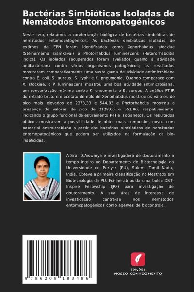 Neste livro, relatámos a caraterização biológica de bactérias simbióticas de nemátodos entomopatogénicos. As bactérias simbióticas isoladas de estirpes de EPN foram identificadas como Xenorhabdus stockiae (Steinernema siamkayai) e Photorhabdus luminescens (Heterorhabditis indica). Os isolados recuperados foram avaliados quanto à atividade antibacteriana contra vários organismos patogénicos; os resultados mostraram comparativamente uma vasta gama de atividade antimicrobiana contra E. coli, S. aureus, S. typhi e K. pneumonia. Quando comparado com X. stockiae, o P. luminescens mostrou uma boa atividade antimicrobiana, em concentração máxima contra K. pneumonia e S. aureus. A análise FT-IR do extrato bruto em acetato de etilo de Xenorhabdus mostrou os valores de pico mais elevados de 2373,33 e 544,93 e Photorhabdus mostrou a presença de valores de pico de 2128,00 e 552,80, respetivamente, indicando o grupo funcional de estiramento P-H e isocianetos. Os resultados obtidos mostraram a possibilidade de obter mais compostos novos com potencial antimicrobiano a partir das bactérias simbióticas de nemátodos entomopatogénicos que podem ser utilizados na formulação de bio-inseticidas.