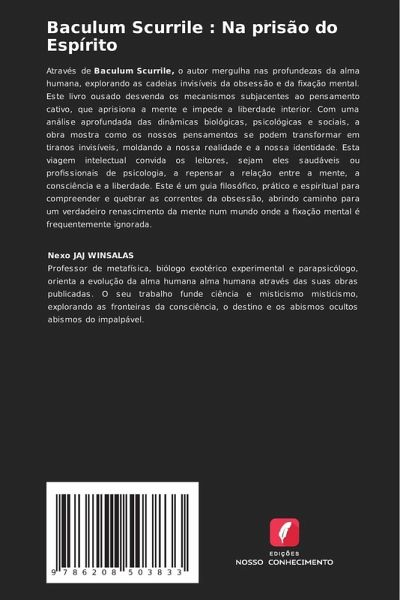 Através de Baculum Scurrile, o autor mergulha nas profundezas da alma humana, explorando as cadeias invisíveis da obsessão e da fixação mental. Este livro ousado desvenda os mecanismos subjacentes ao pensamento cativo, que aprisiona a mente e impede a liberdade interior. Com uma análise aprofundada das dinâmicas biológicas, psicológicas e sociais, a obra mostra como os nossos pensamentos se podem transformar em tiranos invisíveis, moldando a nossa realidade e a nossa identidade. Esta viagem intelectual convida os leitores, sejam eles saudáveis ou profissionais de psicologia, a repensar a relação entre a mente, a consciência e a liberdade. Este é um guia filosófico, prático e espiritual para compreender e quebrar as correntes da obsessão, abrindo caminho para um verdadeiro renascimento da mente num mundo onde a fixação mental é frequentemente ignorada.