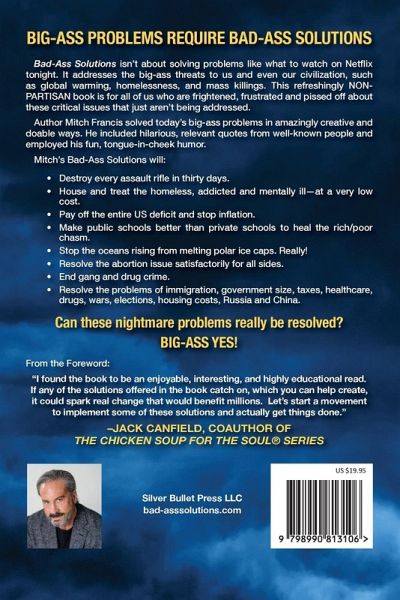 BIG-ASS PROBLEMS REQUIRE BAD-ASS SOLUTIONS Bad-Ass Solutions isn't about solving problems like what to watch on Netflix tonight. It addresses the big-ass threats to us and even our civilization, such as global warming, homelessness, and mass killings. This refreshingly NONPARTISAN book is for all of us who are frightened, frustrated and pissed off about these critical issues that just aren't being addressed. Author Mitch Francis solved today's big-ass problems in amazingly creative and doable ways. He included hilarious, relevant quotes from well-known people and employed his fun, tongue-in-cheek humor. Mitch's Bad-Ass Solutions will:Destroy every assault rifle in thirty days. House and treat the homeless, addicted and mentally ill-at a very low cost. Pay off the entire US deficit and stop inflation. Make public schools better than private schools to heal the rich/poor chasm. Stop the oceans rising from melting polar ice caps. Really! Resolve the abortion issue satisfactorily for all sides. End gang and drug crime. Resolve the problems of immigration, government size, taxes, healthcare, drugs, wars, elections, housing costs, Russia and China. Can these nightmare problems really be resolved? BIG-ASS YES! BAD-ASS SOLUTIONS For Today's BIG-ASS Problems _______________________ From the Foreword: "I found the book to be an enjoyable, interesting, and highly educational read. If any of the solutions offered in the book catch on, which you can help create, it could spark real change that would benefit millions. Let's start a movement to implement some of these solutions and actually get things done." -JACK CANFIELD, COAUTHOR OF THE CHICKEN SOUP FOR THE SOUL® SERIES