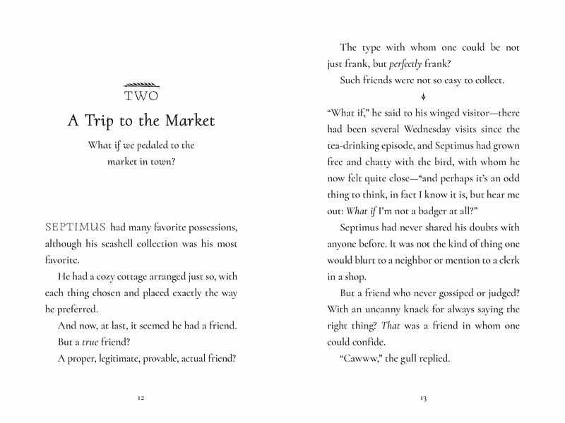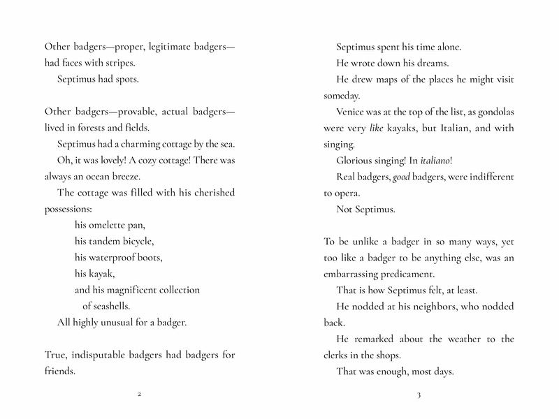 Septimus is not good at being a badger. He adores the sunset. He dreams of going to Venice. And he lives alone in a charming cottage by the sea. He's not unhappy with his tidy, solitary life, but there are times when being so bad at badgerdom makes him wonder if he's even a badger at all. When a gull of very few words lands on the windowsill, Septimus leaps at the possibility of friendship. However, his new confidant soon goes missing and Septimus is bereft. Determined to find his best--and only--friend, he ventures into new territory and encounters a cast of surprising characters. Can Septimus be as brave and bighearted as he'll need to be to find Gully? Or is he really a bad badger after all? Bad Badger is a young middle-grade novel about badgers, gulls, and learning that staying true to yourself means knowing who you are to begin with.