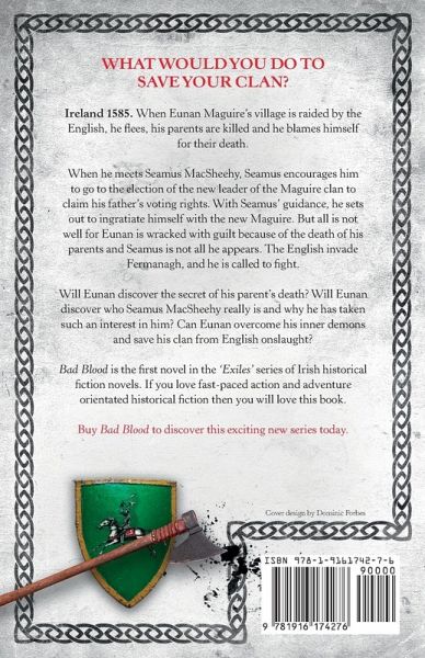 ¿ ¿ ¿ ¿ ¿ "Bad Blood is a fantastic historical fiction novel that does not shy away from the dark complications of the world," - Reedsy Discovery ¿¿ ¿ ¿ ¿ ¿ (4.5 stars) "Bad Blood is a riveting page turner with well-developed characters and vivid descriptions, transporting the reader back to a more violent, unsettled time in history," - The Historical Fiction Company A gripping, fast-paced historical fiction adventure set in rebellious Ireland in the 1590s. Eunan Maguire lives in a small village in Fermanagh. He is mistreated by his parents and then taken to Enniskillen as a hostage to ensure his father's loyalty. He returns after being trained as a Galloglass warrior to confront his parents and to ensure his father pledges to the prospective new Maguire. But before he can do that the English raid his village, his parents are killed, he flees to save himself, and he blames himself for their death. When he flees he meets Seamus MacSheehy, the head of a wandering band of Galloglass warriors. Seamus listens to his story and encourages him to take his father's title of the head of the village. Eunan goes to the election of the new leader of the Maguire clan to claim his father's voting rights. With Seamus's guidance, he sets out to ingratiate himself with the new Maguire. But all is not well for Eunan is wracked with guilt because of the death of his parents and Seamus is not all he appears. Fermanagh is torn apart by faction fighting and the English invade. He is called to fight for the new Maguire. Will Eunan find out why his parents hated him so much and was it connected to the mysterious circumstances around their death? Will Eunan discover who Seamus MacSheehy really is and why he has taken such an interest in him? Or will the clan fall and perish under the English onslaught? Bad Blood is the first book in the epic Irish historical fiction Exiles series. It is set against the backdrop of the Elizabethan wars in Ireland in the 1590s. A world of Irish clans, their politics and the fight for supremacy, where spies and intrigue prosper, where the embers burn for a rebellion against the English crown. If you love fast-paced action and adventure orientated historical fiction, then you will love this book. Buy Bad Blood to discover this exciting new series today.