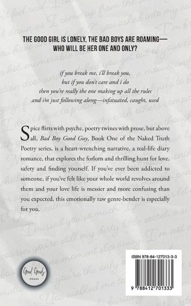 THE GOOD GIRL IS LONELY, THE BAD BOYS ARE ROAMING-WHO WILL BE HER ONE AND ONLY? if you break me, i'll break you,but if you don't care and i dothen you're really the one making up all the rulesand i'm just following along-infatuated, caught, used Spice flirts with psyche, poetry twines with prose, but above all, Bad Boy Good Guy, Book One of the Naked Truth Poetry series, is a heart-wrenching narrative, a real-life diary romance, that explores the forlorn and thrilling hunt for love, safety and finding yourself. If you've ever been addicted to someone, if you've felt like your whole world revolves around them and your love life is messier and more confusing than you expected, this emotionally raw genre-bender is especially for you.