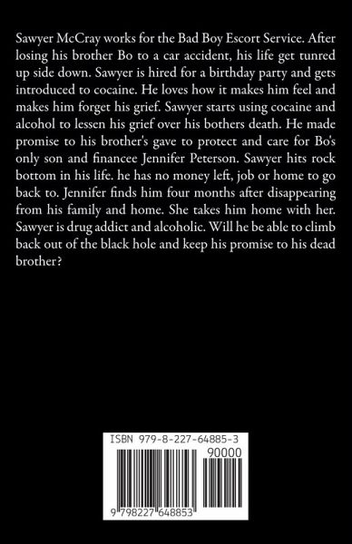Sawyer McCray works for the Bad Boy Escort Service. After losing his brother Bo to a car accident, his life get tunred up side down. Sawyer is hired for a birthday party and gets introduced to cocaine. He loves how it makes him feel and makes him forget his grief. Sawyer starts using cocaine and alcohol to lessen his grief over his bothers death. He made promise to his brother's gave to protect and care for Bo's only son and financee Jennifer Peterson. Sawyer hits rock bottom in his life. he has no money left, job or home to go back to. Jennifer finds him four months after disappearing from his family and home. She takes him home with her. Sawyer is drug addict and alcoholic. Will he be able to climb back out of the black hole and keep his promise to his dead brother?