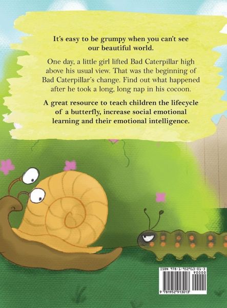 It's easy to be grumpy when you can't see our beautiful world.Bad Caterpillar spent his days chomping on leaves and walking back and forth on a gray path. When he encountered ants, snails, and cats who shared the garden, he would say rudely, "Humph, get out of my way!" One day, a little girl lifted Bad Caterpillar high above his usual view. That was the beginning of Bad Caterpillar's change. Find out what happened after he took a long, long nap in his cocoon.The little ones in your life will love this story of a grumpy creature's transformation.A great resource for preschool and elementary teachers to teach the lifecycle of a butterfly and the power of the word yet. Students will learn growth mindset, increase social emotional learning and their emotional intelligence.Bad Caterpillar is an instant classic with beautiful illustrations and a meaningful lesson that your kid will read again and again.