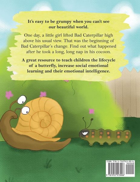 It's easy to be grumpy when you can't see our beautiful world.Bad Caterpillar spent his days chomping on leaves and walking back and forth on a gray path. When he encountered ants, snails, and cats who shared the garden, he would say rudely, "Humph, get out of my way!"One day, a little girl lifted Bad Caterpillar high above his usual view. That was the beginning of Bad Caterpillar's change. Find out what happened after he took a long, long nap in his cocoon.The little ones in your life will love this story of a grumpy creature's transformation.A great resource for preshool and elementary teachers to teach the lifecycle of a butterfly and the power of the word yet. Students will learn growth mindset, increase social emotional learning and their emotional intelligence.Bad Caterpillar is an instant classic with beautiful illustrations and a meaningful lesson that your kid will read again and again.