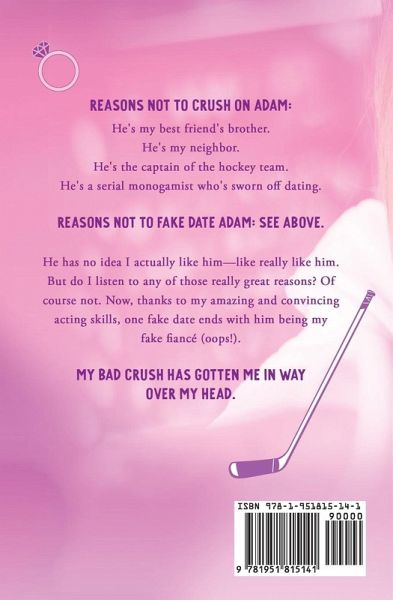 Reasons not to crush on Adam: He's my best friend's brother.He's my neighbor.He's the captain of the hockey team.He's a serial monogamist who's sworn off dating.Reasons not to fake date Adam: See above.He has no idea I actually like him-like really like him.But do I listen to any of those really great reasons? Of course not.Now, thanks to my amazing and convincing acting skills, one fake date ends with him being my fake fiancé (oops!).My bad crush has gotten me in way over my head.