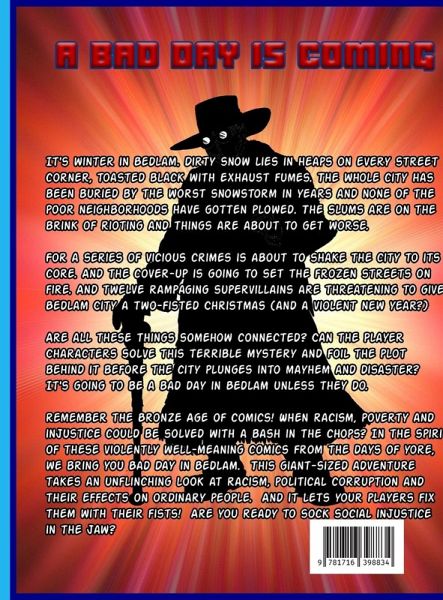 It's winter in Bedlam. Dirty snow lies in heaps on every street corner, toasted black with exhaust fumes. The whole city is buried under the worst snow in years and none of the slums have gotten plowed. They're on the brink of rioting and things are about to get worse. For a series of vicious crimes is about to shake the city to its core. And the cover-up is going to set the frozen streets on fire. And twelve rampaging supervillains are threatening to give Bedlam City a two-fisted Christmas (and a violent new year?) It's up to you to stop them, and it's going to be a bad day in Bedlam if you can't. Do you remember the Bronze Age of comics? That wonderful, horrible period between 1970 and 1978, when comics tried to get "relevant"? When racism, poverty and injustice could be solved with a bash in the chops! In the spirit of these violently well-meaning comics from the days of yore, we bring you Bad Day in Bedlam. This giant-sized, 212 page adventure gives us an unflinching look at racism, political corruption and their effects on ordinary people. And it lets your players fix them with their fists! It gives you ten scenes, thirteen dastardly supervillains, dozens of supporting npcs from every walk of life! Eleven knock-down, drag-out superbattles, enough to slake your players' bloodthirst for months! Plus trash-littered alleys, tormented angst, moral gray zones and at least two vigilantes who dress in black and brood in rooftops in the dark! Are you ready to sock social injustice in the jaw?