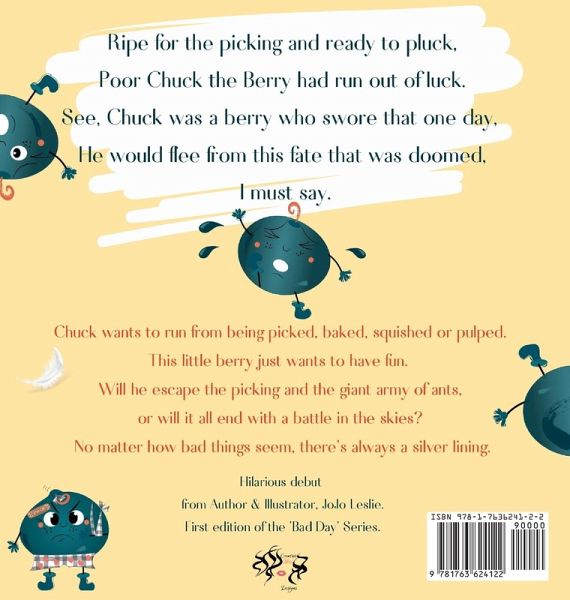 Ripe for the picking and ready to pluck,Poor Chuck the Berry had run out of luck.See, Chuck was a berry who swore that one day, He would flee from this fate that was doomed, I must say. Chuck wants to run from being picked, baked, squished or pulped. This little berry just wants to have fun. Will he escape the picking and the giant army of ants, or will it all end with a battle in the skies? No matter how bad things seem, there's always a silver lining. Hilarious debut from Author & Illustrator, JoJo Leslie. First edition of the 'Bad Day... Series.' Book Review...This is an adorable rhyming story full of fun. It encourages conversations about finding your path, being an individual, and living life to the fullest. The illustrations are joyous and full of flavour, a feast for the eyes with added detail to take in and a spider and a curious cat to search for on each page. As a Where's Wally fan, this was a huge bonus for me.One to become a favourite!...Kelly Sgroi Children will delight in spotting the spider and curious cat throughout the story as they follow Chuck on his journey.