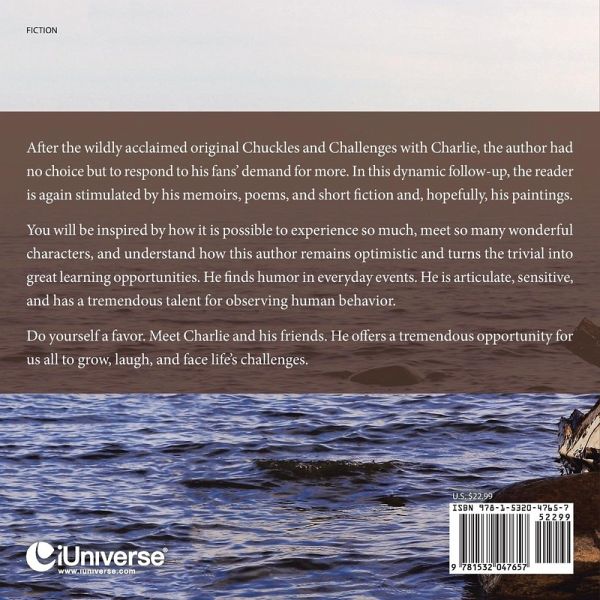 After the wildly acclaimed original Chuckles and Challenges with Charlie, the author had no choice but to respond to his fans demand for more. In this dynamic follow-up, the reader is again stimulated by his memoirs, poems, and short fiction and, hopefully, his paintings. You will be inspired by how it is possible to experience so much, meet so many wonderful characters, and understand how this author remains optimistic and turns the trivial into great learning opportunities. He finds humor in everyday events. He is articulate, sensitive, and has a tremendous talent for observing human behavior. Do yourself a favor. Meet Charlie and his friends. He offers a tremendous opportunity for us all to grow, laugh, and face lifes challenges.