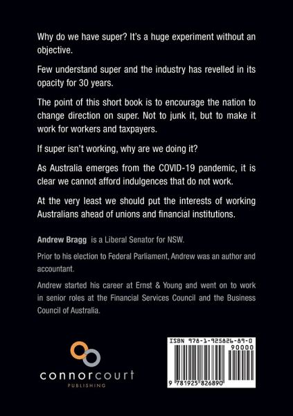 This new book was written whilst Andrew has been in the Parliament, principally between July 2019 and February 2020. Few understand superannuation well and the industry has revelled in its opacity for 30 years. It is Australia's biggest closed shop. The point of this monograph is to encourage the nation to change direction on super. Not to junk it, but to make it work. Put simply, if it isn't working, why are we doing it? As Australia faces the Coronavirus, it is clear the nation cannot afford indulgences that do not work."