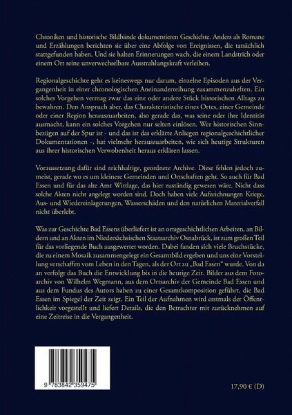 Das Buch "Bad Essen - Bilder im Spiegel der Zeit" führt ein in die Geschichte des Kurortes Bad Essen und zeigt dessen Entwicklung in den vergangenen 125 Jahren anhand ausgewählter Fotografien, die zum einen die Welt des frühen Kurortes zwischen 1900 und 1925 zeigen und zum anderen den nachhaltigen Wandel im Ortsbild abbilden. Die schwarz-weißen Fotografien spannen einen zeitlichen Rahmen von 1898 bis 2010. Sie dokumentieren so einen Entwicklungsprozess, dessen Ergebnis ein malerischer Kirchplatz mit einem unverwechselbaren Flaire ist. Zusammen mit den vielen denkmalgeschützten Fachwerkbauten in seinem Zentrum verfügt der Ort so über eine Kulisse, die sich durch eine traditionsbehaftete Atmosphäre auszeichnet. Diese in ihrer historischen Entwicklung nachzuzeichnen ist Gegenstand des Buches von Dr. Wolfgang Huge, der seinen Heimatort porträtiert.
