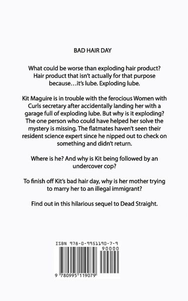What could be worse than exploding hair product? Hair product that isn’t actually for that purpose because…it’s lube. Exploding lube. Kit Maguire is in trouble with the ferocious Women with Curls secretary after accidentally landing her with a garage full of exploding lube. But why is it exploding? The one person who could have helped her solve the mystery is missing. The flatmates haven’t seen their resident science expert since he nipped out to check on something and didn’t return. Where is he? And why is Kit being followed by an undercover cop? To finish off Kit’s bad hair day, why is her mother trying to marry her to an illegal immigrant? Find out in this hilarious sequel to Dead Straight.
