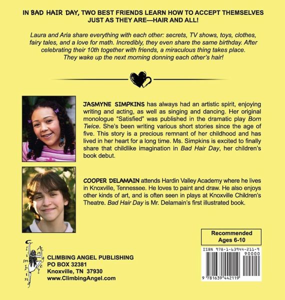 In BAD HAIR DAY, two best friends learn how to accept themselves just as they are-hair and all! Laura and Aria share everything with each other: secrets, TV shows, toys, clothes, fairy tales, and a love for math. Incredibly, they even share the same birthday. After celebrating their 10th together with friends, a miraculous thing takes place. They wake up the next morning donning each other's hair! In BAD HAIR DAY, two best friends learn how to accept themselves just as they are-hair and all! Laura and Aria share everything with each other: secrets, TV shows, toys, clothes, fairy tales, and a love for math. Incredibly, they even share the same birthday. After celebrating their 10th together with friends, a miraculous thing takes place. They wake up the next morning donning each other's hair! In BAD HAIR DAY, two best friends learn how to accept themselves just as they are-hair and all! Laura and Aria share everything with each other: secrets, TV shows, toys, clothes, fairy tales, and a love for math. Incredibly, they even share the same birthday. After celebrating their 10th together with friends, a miraculous thing takes place. They wake up the next morning donning each other's hair!