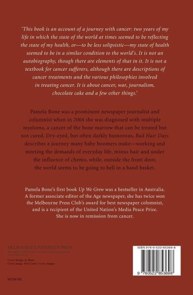 This is ostensibly a cancer diary, the story of one woman's journey with an illness. Pamela's cancer first manifested itself while on assignment in a refugee camp on the Chad-Sudan border in Africa. She examines the issues of terminal illness, how we die and different attitudes towards mortality. It also a story of a journalist, her working life, what work means to us and work defines us.Dry-eyed, but often darkly humorous, ""Bad Hair Days"" describes a journey many baby boomers make-working and meeting the other demands of everyday life, minus hair and under the influence of chemo, while, outside the front door, the world seems to be going to hell in a hand basket.Issues covered in ""Bad Hair Days"" include: Euthanasia, Assisted Suicide, grief, chemotherapy, death and dying, world politics, Darfur, Sudan, AIDS, refugees, poverty.It is a very accessible read and will appeal particularly to a female readership, fans of Pamela Bone's, readers who will remember her columns in ""The Age"", those interested in a personal journey of cancer, treatment and recovery.""But Bad Hair Days"" also articulates larger issues in the world today- politics, the Iraq war, poverty, and general society.