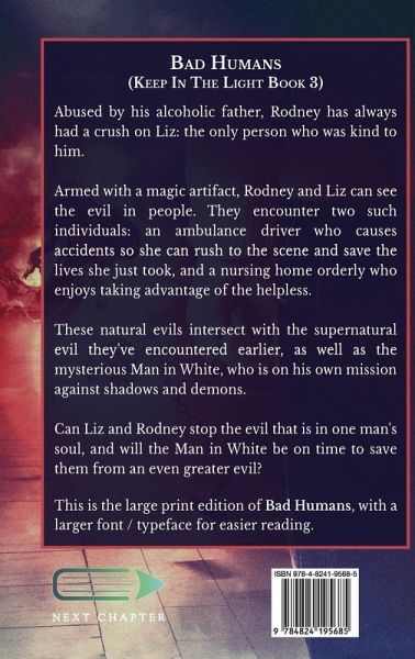 Abused by his alcoholic father, Rodney has always had a crush on Liz: the only person who was kind to him. Armed with a magic artifact, Rodney and Liz can see the evil in people. They encounter two such individuals: an ambulance driver who causes accidents so she can rush to the scene and save the lives she just took, and a nursing home orderly who enjoys taking advantage of the helpless. These natural evils intersect with the supernatural evil they've encountered earlier, as well as the mysterious Man in White, who is on his own mission against shadows and demons. Can Liz and Rodney stop the evil that is in one man's soul, and will the Man in White be on time to save them from an even greater evil? This is the large print edition of Bad Humans, with a larger font / typeface for easier reading.