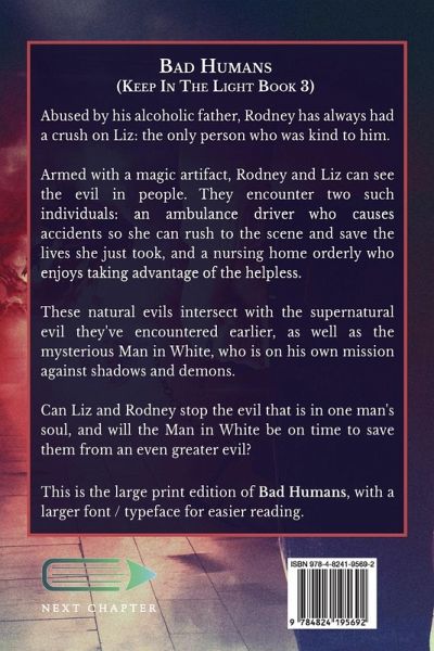 Abused by his alcoholic father, Rodney has always had a crush on Liz: the only person who was kind to him. Armed with a magic artifact, Rodney and Liz can see the evil in people. They encounter two such individuals: an ambulance driver who causes accidents so she can rush to the scene and save the lives she just took, and a nursing home orderly who enjoys taking advantage of the helpless. These natural evils intersect with the supernatural evil they've encountered earlier, as well as the mysterious Man in White, who is on his own mission against shadows and demons. Can Liz and Rodney stop the evil that is in one man's soul, and will the Man in White be on time to save them from an even greater evil? This is the large print edition of Bad Humans, with a larger font / typeface for easier reading.