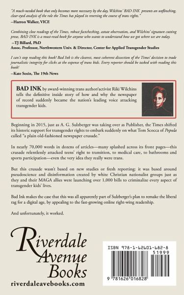 In BAD INK, award-winning trans activist Riki Wilchins, definitively chronicles how and why the nation's newspaper of record became the leading national voice for attacking transgender kids. Beginning in 2015 just as A. G. Sulzberger was taking over as Publisher, the New York Times underwent a strange shift: from its long-time support for transgender rights overnight it became the nation's leading voice attacking transgender kids. In nearly 70,000 words in dozens of articles, it attacked their right to transition, to medical care, to sports participation-even the very idea that they were transgender. It was-as Tom Scocca summed up in Popula- "a plain old-fashioned newspaper crusade," But the Times' crusade wasn't based on new reporting or fresh medical evidence, but on talking points being promoted by white Christian nationalist organizations devoted to eradicating gay and transgender people. And it was timed just as MAGA politicians introduced over 1,000 bills in scores of states to outlaw every aspect of trans kids' lives. It was all apparently part of Sulzberger's new plan to remake that liberal rag so it could appeal to right-wing readers for the digital age. And unfortunately, it worked. ****************************************************************** "A much-needed book that only becomes more necessary by the day, Wilchins' BAD INK presents an unflinching, clear-eyed analysis of the role the Times has played in reversing the course of trans rights." --Harron Walker, VICE Combining close readings of the Times, robust factchecking, astute observation, and Wilchins' signature cutting prose, BAD INK is a must-read book for anyone who wants to understand how we got where we are today. --TJ Billard, PhD Assoc. Professor, Northwestern Univ. & Director, Center for Applied Transgender Studies I can't stop reading this book! Bad Ink is the clearest, most coherent dissection of the Times' decision to trade journalistic integrity for clicks at the expense of trans kids. Every reporter should be tasked with reading this book! --Kate Sosin, The 19th News
