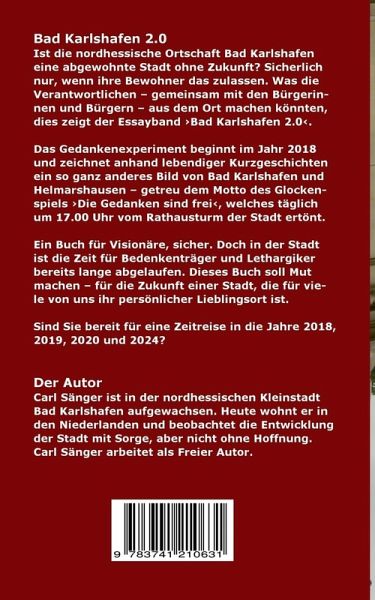 Ist die nordhessische Ortschaft Bad Karlshafen eine abgewohnte Stadt ohne Zukunft? Sicherlich nur, wenn ihre Bewohner das zulassen. Was die Verantwortlichen - gemeinsam mit den Bürgerinnen und Bürgern - aus dem Ort machen könnten, dies zeigt der Essayband 'Bad Karlshafen 2.0'. Das Gedankenexperiment beginnt im Jahr 2018 und zeichnet anhand lebendiger Kurzgeschichten ein so ganz anderes Bild von Bad Karlshafen und Helmarshausen - getreu dem Motto des Glockenspiels 'Die Gedanken sind frei', welches täglich um 17.00 Uhr vom Rathausturm der Stadt ertönt. Ein Buch für Visionäre, sicher. Doch in der Stadt ist die Zeit für Bedenkenträger und Lethargiker bereits lange abgelaufen. Dieses Buch soll Mut machen - für die Zukunft einer Stadt, die für viele von uns ihr persönlicher Lieblingsort ist.Sind Sie bereit für eine Zeitreise in die Jahre 2018, 2019, 2020 und 2024?