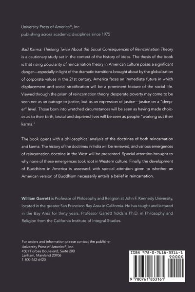 Bad Karma: Thinking Twice About the Social Consequences of Reincarnation Theory is a cautionary study set in the context of the history of ideas. The book analyzes the doctrines of both reincarnation and karma, reviews their history in India, and the emergences of reincarnation doctrine in the West. The thesis of the book is that rising popularity of reincarnation theory in American culture poses a significant danger.