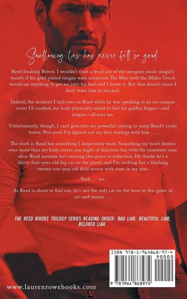 Swallowing lies has never felt so good. Reed freaking Rivers. I wouldn't trust a word out of the arrogant music mogul's mouth if his gold-plated tongue were notarized. The man with the Midas touch would say anything to get me into his bed, and I know it. But that doesn't mean I don't want him to succeed. Indeed, the moment I laid eyes on Reed while he was speaking at an on-campus event I'd crashed, my body physically ached to feel his golden fingers - and tongue - all over me. Unfortunately, though, I can't give into my powerful craving to jump Reed's cocky bones. Not until I've figured out my best strategy with him. The truth is Reed has something I desperately want. Something my heart desires even more than my body craves one night of delicious fun with the yummiest man alive. Reed assumes he's running this game of seduction. He thinks he's a thirty-four-year-old big cat on the prowl, and I'm nothing but a blushing twenty-one-year old field mouse with stars in my eyes. Yeah...no. As Reed is about to find out, he's not the only cat on the hunt in this game of cat-and-mouse.... Bad Liar is the first book of the stand-alone Reed Rivers Trilogy. The full trilogy is Bad Liar, Beautiful Liar, and Beloved Liar, to be listened to in that order.
