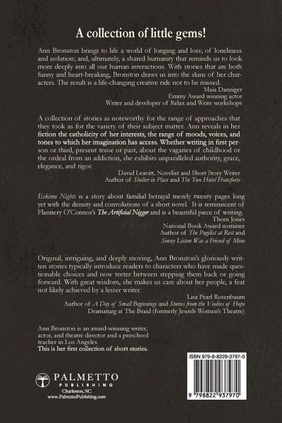 There are a million ways to screw up at mothering. One character in Ann Bronston's hilarious, heartbreaking debut collection, Bad Mothers and Other Miscreants, silently inserts fuck into conversations with her young children. Another secretly wishes her troubled son dead. A third, fueled by religious mania, visits violence upon her own child. lf these maternal crimes sound grim, be assured that Bad Mothers and Other Miscreants is a joy to read. The thirteen stories in Bad Mothers and Other Miscreants range in length from six to thirty-eight pages. Protagonists include a barmaid, professor, housewife, nun, murderer-two, actually-and a WWII vet. There is a street kid with a taste for rough sex and an aging actress. Divorcees and drunks abound, and children and dogs often steal the show. Suzanne Warren, reviewer, Pembroke Magazine A collection of little gems! With stories that are both funny and heart-breaking, Bronston draws us into the skins of her characters.Maia DanzigerWriter and developer of Relax and Write workshops Whether writing in the first person or third, present tense or past, about the vagaries of childhood or the ordeal from an addiction, she exhibits unparalleled authority, grace, elegance, and rigor.David Leavitt, Novelist, Short Story Writer Author of The Secret Life of Cranes and the short story, Gravity, among many other works Eskimo Nights is a story about familial betrayal merely twenty pages long yet with the density and convolutions of a short novel.Thom JonesNational Book Award nominee Author of The Pugilist at Rest