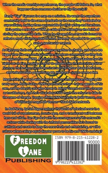 When the media worships superheroes, the people will follow. So, what happens when someone decides to flip the script? Randy "Figs" Figueroa is a man on a mission. He wants the superhero community held to the same standards as the ones they've labeled as supervillains, making them accountable for their action and inactions. He's gotten a new job at VNN, a cable news network on the brink of circling the proverbial drain. When he changed the network's format to reflect a more villainous state of mind, he never expected it to erupt in such a spectacular manner. As Figs soon finds out, however, there's always a reaction to change, and none are bigger than the one coming from the superhero community as they lash out against him and VNN. A trenchant priest called Father Badass has his sights set on Figs, leading up a cast of do-gooders like the electrifying Silver Stunner, the Amazon turned dominatrix crime fighter Masked Mistress, and indestructible powerhouse Mr. Hardcore-just to name a few. Meanwhile, Figs has a wide array of anchors and producers dogging his every move. Robin Sacks-VNN's premiere anchor-has an agenda of his own, and he doesn't care who knows it. Mindy Greene sees the changes as troublesome, and she's vocal about how much she refuses to take in the name of change. Topping off the VNN hierarchy is Brett Vernon, son of billionaire mogul Jeb Vernon-head of the network. In Bad News, Daniel Aegan explores the world of televised news in a world full of superhumans, cosmic egos, and a translucent veil between hero and villain that paints a vivid interpretation of real life. Can Figs deal with the consequences of his network's actions while dealing with the inflated personalities he's forced to cultivate and create to keep the news fresh and entertaining, or will a culture where ratings equal disaster prove to be his and VNN's undoing?